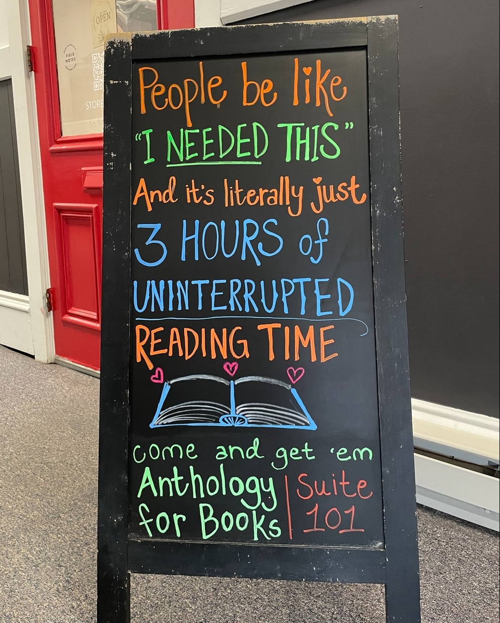 "People be like 'I needed this' and it's literally just 3 hours of unlimited reading time. Come and get'em." That was the sidewalk chalkboard message in front of Anthology for Books, Geneseo, Ill., which noted: "We don't sell time, but we DO sell the books you'll want to be reading when the time comes! And if you just want to come in and talk about how there are so many books and so little time, we're here for that, too."