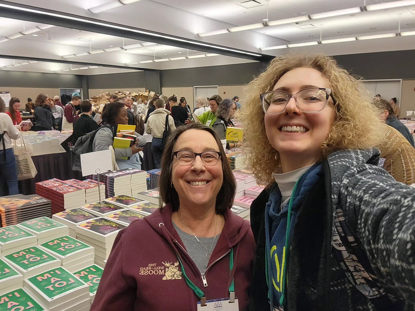 Black Walnut Books, Glens Falls, N.Y.: "Self portrait of bookseller with galley room finds. Booksellers really really love books, and maneuvering in the galley room is basically an Olympic sport. I'm beyond excited about all of these incredible books, and can't wait to start reading them. Today our #abawinterinstitute keynote speakers were the legendary bookseller Miss Janet from @sourcebooksellers and @levar.burton which was incredible!"