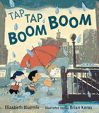 The first few raindrops appear in close-up, as if just outside the edge of a child's umbrella, as readers view a girl and boy from behind, looking through an iron gate. Nimbus clouds threaten to blot out a sunny sky: "Tap TAP,/ dark clouds./ Tap TAP,/ damp air./ Tap TAP,/ cold drops/ of rain/ dot hair," goes Bluemle's onomatopoeic text. On the next page, we're on the opposite side of the gate, seeing the faces of the boy and girl. The spines of street vendor's umbrella mimic the lines of the gate ("Street carts appear:/ 'Umbrellas here!'/ Tap TAP/ Tap TAP/ BOOM BOOM"). As the thunder gets louder and the storm draws closer, raindrops grow more plentiful, and paces quicken for dogs and people. "Now harder!/ Now faster!/ Big rain/ side blaster." Next, Karas shows the view from platform level, looking up the stairs at dogs and people descending the subway stairs ("Whose feet/ and knees/ are these?"). Children will embrace the anonymous cast of characters ("big, big fellow/ with tiny umbrella./ It's yellow" and "one girl/ all fancy./ She's late/ for dancing"). As they all take shelter, "The storm/ above/ makes friends/ of strangers."