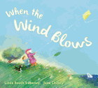 Laundry wafts on the line as a child and dog peer out of an upstairs window in a blue-roofed cape house. "When the wind blows..." reads the opening line in a hand-lettered purple that matches the home's exterior. "Windows rattle./ Doors creeaaak./ Chimes sing./ We peek," the text continues in white type that pops against cornflower blue skies. Grandma takes the boy and dog out to fly a yellow kite, while his mother, clad in a blue coat, pushes a baby in a red stroller. A lighthouse hints at a nearby body of water, and cows complete the pastoral scene. "Trees dance./ Spiders curl./ Mice shiver./ Leaves swirl." The beach grasses in Christy's multimedia art mimic the swirl of the leaves, where children can spy a spider's web and two mice taking refuge. The repetition of "When the wind blows..." gives the story its structure, and Christy adds a visual storyline. As the child loses hold of the kite and impatiently pursues it (his mother recovers the kite), Grandma waves at a sailor and a top hat blows off the groom departing the church. "Skies darken./ Thunder booms," driving everyone inside.