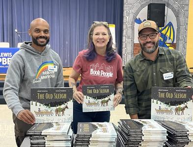 Caldecott Honorees Jarrett and Jerome Pumphrey, co-creators of The Old Sleigh (Norton Books for Young Readers), visited Lee Lewis Campbell Elementary in their hometown of Austin, Tex., in partnership with BookPeople. In their presentation to almost 200 students, the brothers discussed their collaborative approach and art process. Pictured: Jerome Pumphrey, Rachel McInnes of BookPeople, and Jarrett Pumphrey.