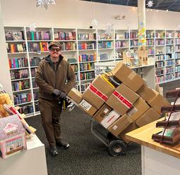 Posted by Neighborhood Books, Presque Isle, Maine: "I was driving around trying to figure out where to pick up my UPS boxes for the day because we NEED to have our Dear Debbie books ready for 10AM tomorrow, and since we're closed Mondays UPS typically doesn't deliver to us. I checked in with this guy who said I'm bringing them right to you! Now that's service! Look at all these boxes! I wouldn't have wanted to put them all in my car anyways. We'll be ready for our Freida McFadden fans first thing tomorrow morning thanks to our great UPS service! THANK YOU!!! Just doing our little part to keep UPS jobs here!"