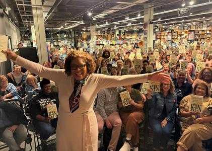 Kepler's Books & Magazines, Menlo Park, Calif., hosted a sold-out appearance by Tayari Jones, who discussed her new novel, Kin (Knopf), with novelist Natalie Baszile. (photo: Heather Birchall, Kepler's Literary Foundation)