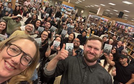 Barnes & Noble at The Grove, Los Angeles, Calif., hosted the launch event for Marcus Kliewer's (front) The Caretaker, with actress/author Judy Greer (front, left) moderating. The Caretaker is the inaugural title from the 12:01 Books horror imprint, and Emily Bestler, Scott Glassgold, and Liz Parker, who are behind the joint venture, were in attendance, along with David Bruckner, director of upcoming movie version of The Caretaker.