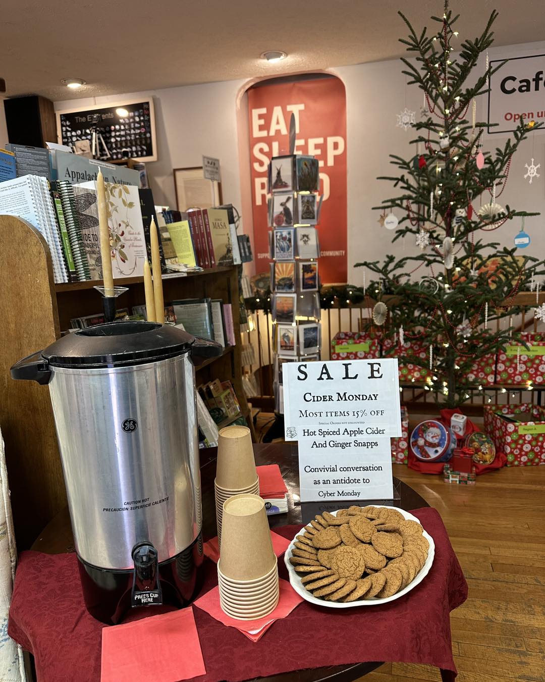 Volume Bookshop & Studio, Buckhannon, W.Va.: "Time for today's Closing Time Book Club on this Small Business Saturday. Instead of recommending a book, I'm going to recommend you read this: To everyone who came in to the store today or over the weekend, regardless of whether you bought something, please know just how appreciative Nicki and I are of you. Our shelves are a bit emptier, our tea supply is smaller, our candy display is barren-er, but our hearts are fuller, and we thank you. We asked you to shop local and you came out to Main Street to show your support. You are wonderful human beings, all of you. Thank you, from the bottom of our hearts."