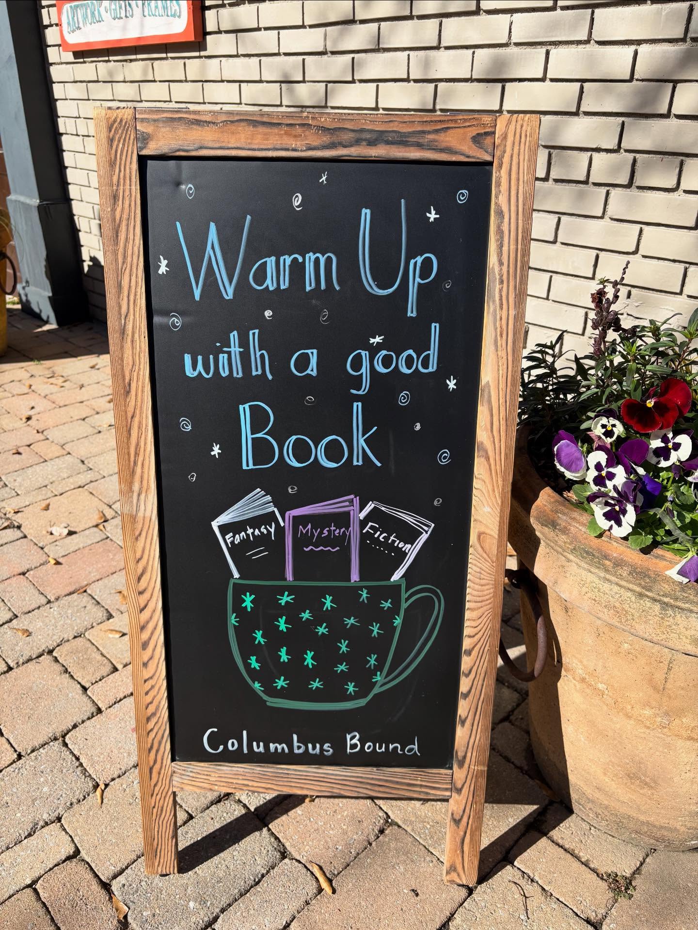 "Warm up with a good book." That was the sidewalk chalkboard message in front of Columbus Bound Bookshop, Columbus, Ga., which noted: "Visit our friends @midtowncoffeehouse for a cuppa and then come see us at Columbus Bound Bookshop to knock the chill off!"