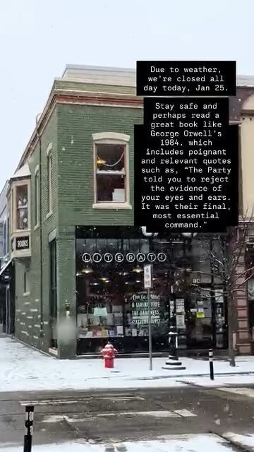 Literati Bookstore, Ann Arbor, Mich., posted on Instagram that it was closed on Sunday because of the storm, adding, "Stay safe and perhaps read a great book like George Orwell's 1984, which includes poignant and relevant quotes such as, 'The Party told you to reject the evidence of your eyes and ears. It was their final, most essential command.' "