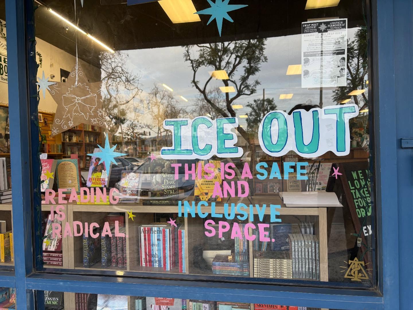 The Open Book, Simi Valley, Calif.: "To the person who tore down our ICE flyer: Thank you for making space for our new and permanent statement in our front window!"