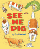 Following the same sentence structure as the previous book, a golden pup with a red collar kicks things off: "See me dig. I like to dig." A raccoon peers from a hole in a nearby tree trunk and looks increasingly alarmed as the golden pup, joined by his canine buddies, begins to dig up the entire field ("We all like to dig. We dig and dig"). The creatures whose homeland the dogs have demolished express their disapproval with icy stares: "Oh, no! They are mad." The pack, of course, finds a new plot of land to explore ("We can dig here") beneath a pirate's skull and crossbones. What will they find?