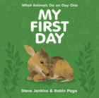 Here they correlate a baby's first day ("you opened your eyes, cried, slept, and drank some milk") with that of many other creatures in nature. Steve Jenkins's signature collage illustrations show a kiwi on its own ("as soon as I hatched, I was ready to take care of myself"), opposite a Siberian tiger licking her kitten clean. "I was born high above the ground--and I landed in a heap. But I wasn't hurt...," says the giraffe. Endnotes explain that when a mother giraffe gives birth, "her baby tucks its head between its front legs and falls five feet"; the calf, uninjured, walks within minutes.
