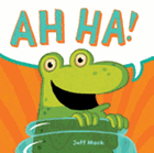 Before the book even begins, the frog reclines in a pond, exclaiming "AAHH!" in a purple speech balloon. Children may not even realize they've hit the title page because Mack uses the title in another purple speech balloon as the frog hero discovers a brown sphere protruding from the pond and says, "AH HA!" The frog climbs up, only to be snatched in a glass jar by two child-size hands, and a dog spectator nearby. The dog, lunging for the frog ("AH HA!" thinks the pooch), accidentally knocks the cap off and frees the captive. A turtle, crocodile and flamingo all make appearances, with narrow escapes and alternating exclamations of "AAHH" and "AH HA."
