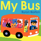 A bus driver named Joe sports a navy-blue uniform and cap, and drives his red bus on a yellow road. "At my first top, one dog gets on my bus," he says, as a spotted, wagging pup climbs aboard. At his second stop, a black cat and purple cat enter the bus. Three more felines get on at the third stop. Youngsters can clearly see the spotted dog at the back of the bus, and the five cats lined up along the right-hand side. Four dogs wait at the last stop, and sit on the left side of the bus, in front of the first dog. Author-artist Byron Barton (My Car) knows children will count the passengers and pulls no punches: "Five dogs and five cats are on my bus." He makes it easy for children to keep tabs on the animals. A magenta boat waits while the bus drops "one dog and two cats" at the dock: "They sail away." Youngsters can see the trio through the boat's windows, and also the seven animals still on the bus.
