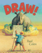 In this marvelous wordless adventure, Raúl Colón (Abuelo) takes us on safari through a boy artist's imagination. Colón, who suffered from asthma as a child, calls to mind in pictures here what Robert Louis Stevenson's words do in "The Land of Counterpane." Colón uses his pencils to summon a safari's worth of animals. The boy artist, pictured in bed in pen-and-inks and watercolor, looks at a book about Africa, a safari hat, sketchbook and stash of pencils nearby. A sequence of full-color images in Colón's signature compositions leads us into the creations of the artist in his imagination. The two styles clearly delineate the bedbound child and his imagined self as artist on safari. The young artist appears with canteen and easel slung over his shoulders, waving to an elephant. The elephant stops to model for a portrait. You could teach an art class from observing the young artist's lines. The elephant, pleased with the results, offers the boy a ride. Zebras pause by an acacia tree for a portrait; the boy contorts himself to sketch a herd of swift-moving giraffes. He gazes at a pride of lions from a safe distance, and a gorilla grabs the boy's hat and lunch as the price for posing. The climax involves a charging rhino in a heart-stopping four-part sequence.