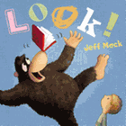 A gorilla enters, scratching its head with the left hand while holding a blue book in the right. Then the gorilla tries wearing the book, and taps the back of a blond boy engrossed in a television program: "Look," says the gorilla. The child ignores the furry creature. The gorilla balances the book on its nose ("Look Look") while waving an arm in front of the TV screen. The child bats the gorilla away and introduces the volume's second word: "Look out." Mack distinguishes who says what by representing the gorilla's words in crayon, and the boy's words in an array of type fonts that emulates collage. As the gorilla's antics grow wilder, the child grows increasingly annoyed ("Look out!," the boy cries). A mishap while juggling books on a tricycle ends with the gorilla destroying the television. Mack creates a two-page spread with a lifelike reproduction of a page that's been torn to reveal the red-faced boy shouting "Out! Out! Out!" After the gorilla exits, the child strikes a pose similar to the one the gorilla opened with, staring at a red book and scratching his head. The gorilla sheepishly returns, and the boy, with the book open, invites the gorilla in with "Look."