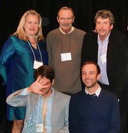 | SCIBA Book Award winners (l. to r., top row): Christine Moore, Tom McNeal, Robert Landau, (bottom) Pseudonymous Bosch (who is supposed to be anonymous, so he covers his face), Jon Klassen. | |