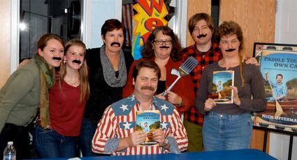 Anderson's Bookshop, Naperville and Downers Grove, Ill., hosted an event for Nick Offerman, star of Parks and Recreation, a native of Minooka and author of Paddle Your Own Canoe: One Man's Fundamentals for Delicious Living (Dutton). Staffers had so much fun that they sprouted mustaches: (from l.) Maura Sokol, Lauren Baltas, owner Becky Anderson, Offerman's sister Laurie Offerman, Larry Law and Kris Nugent, with, in front, star canoeist Nick Offerman.