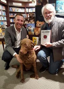 Owen Laukkanen (l.) appeared at Nicola's Books in Ann Arbor, Mich., recently for his new book, The Watcher in the Wall (Putnam). Laukkanen had mentioned on his Facebook page that he was missing his dog Lucy while on tour, so a couple of fans decided to bring their dog Niko to the event so that the author could have a little dog love time.