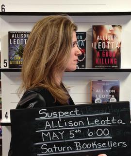 Saturn Booksellers in Gaylord, Mich., used some money the store won from Sisters in Crime to build a "mug shot station." Here, author Allison Leotta, who visited the store for her new novel, The Last Good Girl (Touchstone), poses. When not in use for pictures, Saturn uses the shelves to display books for upcoming mystery events.