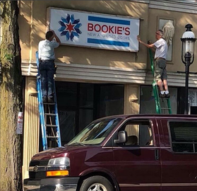 | Hanging the signage at the new Bookie's. | |