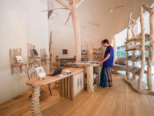 The bookshop itself, much like our little sandbank, is something of an apparition. Curved and clean, the shop is built on stilts above the sand, circled by heavy green and growing bush. It's a moment's walk from the beach. Its shelves are made from wood found on the island, its lights hang on sanded branches, and its ceiling is dotted with glowing stars. To see it is to doubt yourself. It's the book lover's haven, nestled away in everyone else's.