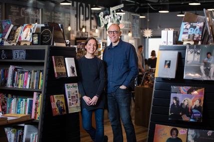 "This picture was taken of us two weeks ago, by a friend who understood both our reluctance--and need--to be photographed as representative of the store. When she asked me (a month ago) what it was I hoped for the picture to say, I said that I wanted it to indicate our welcome into a space that we tend but that belongs to all, for it to not be about Derek and me as individuals, but about the space we inhabit and community we welcome.