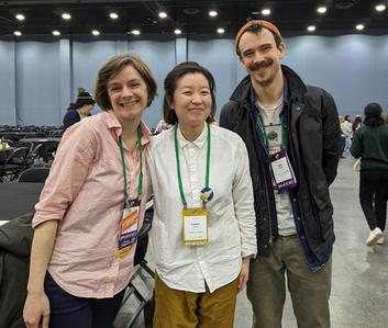 At the lunchtime author reception: Emma Kass and Sam Kass of the Norwich Bookstore in Norwich, Vt., flanking Shelf Awareness associate editor Elaine Cho, whose debut novel, Ocean's Godori, will be published in April by Hillman Grad Books/Zando.