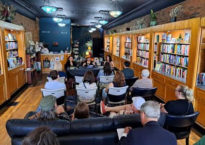 Book Love Bar in Ypsilanti, Mich., hosted a panel on historical mysteries. From left: Kensington authors Dianne Freeman (A Daughter's Guide to Mothers and Murder), Darcie Wilde (The Heir), and Colleen Cambridge (A Fashionably French Murder). (photo: Dan Freeman)