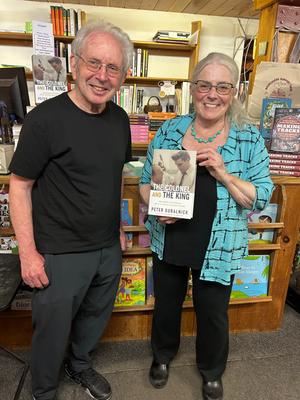 Peter Guralnick appeared last Saturday at Jabberwocky Books in Newburyport, Mass., to discuss his new book, The Colonel and the King: Tom Parker, Elvis Presley, and the Partnership That Rocked the World (Little, Brown). Here: Guralnick with Jabberwocky owner Sue Little, who opened the store in 1972. (photo: Michael Barson)