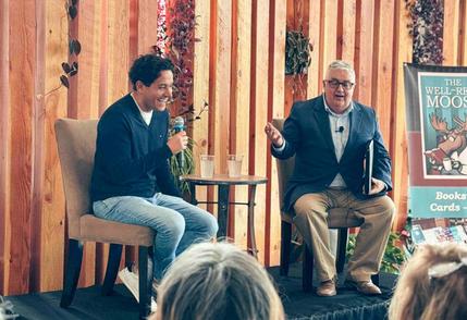 The Well-Read Moose bookstore in Coeur d'Alene, Idaho, hosted Chris Whitaker (l.) for the paperback release of his thriller All the Colors of the Dark (Crown). The event took place at the Vantage Point Brewing Co. and had more than 125 attendees. The bookstore's Liz Burkwist reported, "The audience listened raptly as Chris shared stories of trauma and explained how those experiences influenced his writing and how his writing helped him heal. This event can only be described as lightning in a bottle; it was the perfect author, the perfect venue, the perfect emcee (Mike Kennedy, beloved local business leader and gifted conversationalist), and most importantly, the perfect guests. The atmosphere was charged with enthusiasm and the audience was absolutely charmed by Chris."