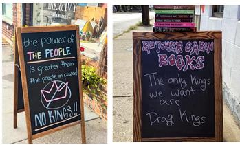 Some indie booksellers took to their sidewalk chalkboards to express support for Saturday's No Kings protests nationwide, including: