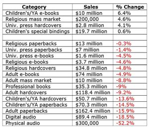 In terms of format, trade hardcover sales dropped 9.6%, to $203.9 million, paperbacks fell 14.8%, to $245.7 million, mass market dropped 8.5%, to $10.2 million, and special bindings inched up 0.6%, to $19.7 million.