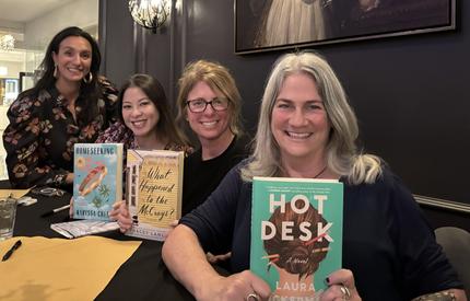 Authors (from r.) Laura Dickerman (Hot Desk, Gallery Books); Tracey Lange (What Happened to the McCrays, Celadon Books), and Karissa Chen (Homeseeking, Putnam) read from their books and answered questions at Booked, an author series run by Providence, R.I., bookseller Katie Kinnell (far left). Copies of the books were sold on site by Books on the Square.