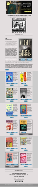 For a sample of the November pre-order e-blast, see this one from Kingfisher Bookstore, Coupeville, Wash.