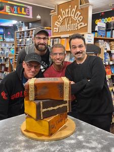 Is it cake? Chicago's Unabridged Bookstore continued its 45th anniversary celebration with a custom-made cake created by their next-door neighbor, Sugar Daddy. Pictured: (from l.) owner Ed Deveraux, store manager Shane Khosropour, owner Patrick Garnett, merchandise manager Simeon Tsanev.Unabridged Bookstore Celebrates 45 years