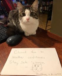 Bookmarx Books, Springfield, Mo.: "We'll be closed today due to weather conditions. Everyone stay safe and warm! Perfect time for some cozy winter reading with the cats."