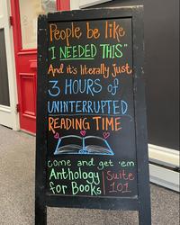 "People be like 'I needed this' and it's literally just 3 hours of unlimited reading time. Come and get'em." That was the sidewalk chalkboard message in front of Anthology for Books, Geneseo, Ill., which noted: "We don't sell time, but we DO sell the books you'll want to be reading when the time comes! And if you just want to come in and talk about how there are so many books and so little time, we're here for that, too."