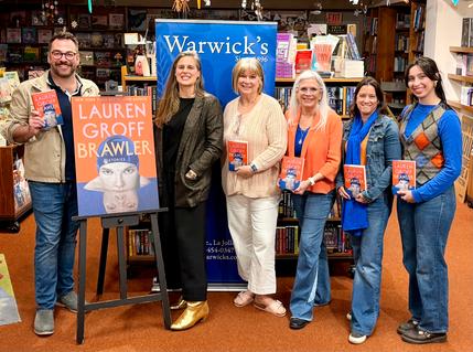 Warwick's, La Jolla, Calif., hosted Lauren Groff, author of The Vaster Wilds and Florida, who discussed and signed her new collection, Brawler (Riverhead). She was in conversation with Jason Blitman, host and producer of the podcast Gays Reading. Pictured: (l.-r.) Jason Blitman, Lauren Groff, Warwick's director of events Julie Slavinsky, and book cover-coordinated booksellers Irene, Cris, and Isabella.