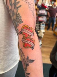 The main event was a daylong flash tattoo offering. Six tattoo artists with whom the store has planned previous flash tattoo fundraisers in support of fighting book bans, Palestinian relief, and reproductive rights, offered their times and talents to provide literary tattoos for Dog-Eared Books' customers. Store owners Amanda Lepper and Ellyn Grimm pledged a 25% lifetime discount to any customer who chose a flash tattoo drawn from the store's branding. Book lovers formed lines that stretched the block starting as early as 7 a.m., camping out with coffees, blankets, and books in every form--hardcovers, paperbacks, e-books, and audiobooks. By day's end, more than 30 customers had shown up to show off their new Dog-Eared Books tattoos and earn lifetime discounts.