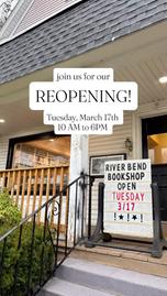 River Bend Bookshop in West Hartford, Conn., had its "soft reopening" Tuesday at the new location on 224 Park Road, not far from its previous space. River Bend also operates a store in Glastonbury. The official grand opening for the new store is scheduled for this coming Saturday, March 28.
