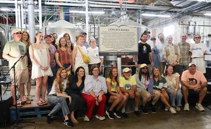 On April 11, Lemuria Books, Jackson, Miss., marked its 50th anniversary with a "a day of music, drinks & fun." There were kids' events, authors discussing what the store has meant to them, live music, food trucks, and a specialty cocktail created for the event. All proceeds benefited the Mississippi Book Festival. As part of the celebration, the store was honored with a marker on the Mississippi Writers Trail. A replica of the marker was featured at the party. Pictured: the marker, many former and current Lemuria booksellers, and co-owners John Evans (seated in the middle with a yellow shirt) and Mel Evans (standing to the far right).